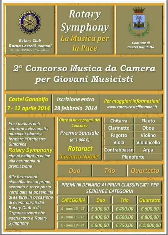 Dal 7 al 12 aprile 2014 il Comune di Castel Gandolfo in collaborazione con il Club Rotary Symphony dei Castelli Romani promuove il 2° Concorso di Musica da Camera per Giovani Musicisti. Il concorso si svolgerà presso la sala Petrolini, in via Prati 7 di Castel Gandolfo, con lo scopo di promuovere e sviluppare la cultura musicale sul nostro territorio.