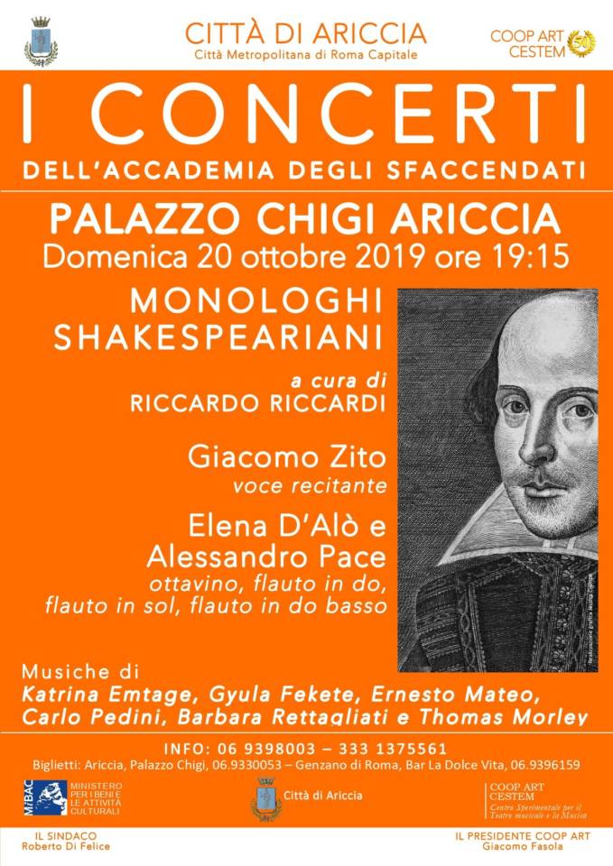 Domenica 20 ottobre, alle ore 19:15, nella Sala Maestra di Palazzo Chigi ventiduesimo appuntamento per il 2019 con “I Concerti dell’Accademia degli Sfaccendati” che propongono uno spettacolo in cui i versi immortali di Shakespeare si intrecciano con la musica del suo tempo e di oggi. Da “La dodicesima notte”, “Molto rumore per nulla“ e “Come vi piace” a “Macbeth”, “Otello” e “Re Lear”; da “Giulio Cesare” e “Antonio e Cleopatra” a “Il mercante di Venezia” e “La tempesta”; per finire col “Sogno di una notte di mezza estate”, celebri monologhi shakespeariani, scelti e collegati drammaturgicamente in un contesto musicale dal professor Riccardo Riccardi, verranno recitati in interazione, ora di commento ora di autonoma espressione, con brani appositamente composti da Katrina Emtage, Gyula Fekete, Ernesto Mateo, Carlo Pedini, Barbara Rettagliati e con brani del compositore elisabettiano Thomas Morley. Interpreti dell’originale pièce teatrale/musicale saranno l’attore Giacomo Zito ed i flautisti Elena D’Alò e Alessandro Pace. Uno spettacolo unico prodotto dagli “Sfaccendati” che si potrà ascoltare solo nella Sala Maestra di Palazzo Chigi. I Concerti dell’Accademia degli Sfaccendati al Palazzo Chigi di Ariccia sono realizzati dalla COOP ART con il patrocinio e il contributo del Comune di Ariccia e del Ministero per i Beni e le Attività Culturali.