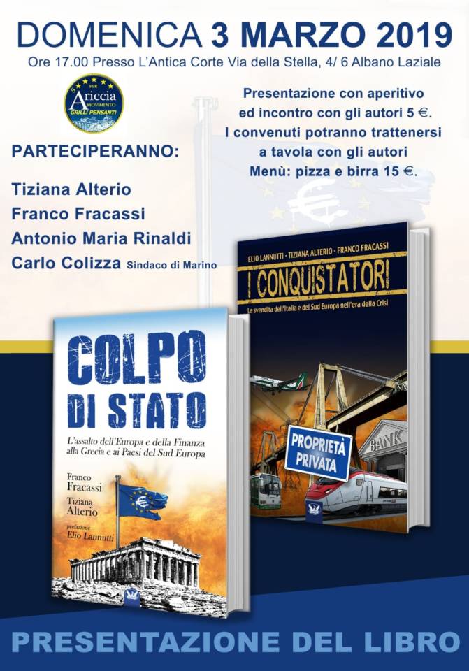 La presentazione del libro ed il confronto con gli Autori avverrà a cura di 5 Stelle per Ariccia – Grilli Pensanti, domenica 3 Marzo ore 17 presso il Ristorante Antica Corte di Albano Laziale.i Cinque Stelle per Ariccia – Grilli Pensanti invitano i Concittadini di Ariccia e dei Castelli all’incontro con gli autori-. Parteciperà anche il noto Economista Antonio Maria Rinaldi.