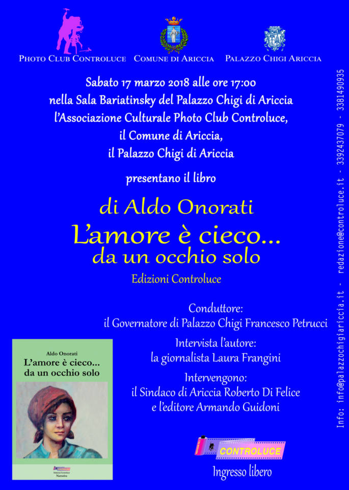 Sabato 17 marzo alle ore 17 nella Sala Bariatinsky del Palazzo Chigi di Ariccia, l’Associazione Culturale Photo Club Controluce e il Comune di Ariccia presentano il libro “L’amore è cieco da un occhio solo” (Ed. Controluce) di Aldo Onorati. La giornalista Laura Frangini intervisterà l’autore. Interverranno il Sindaco di Ariccia Roberto Di Felice e l’editore Armando Guidoni. Condurrà la serata il Governatore di Palazzo Chigi Francesco Petrucci. “L’amore è cieco da un occhio solo” (ed. Controluce) è una raccolta di racconti spassosi, ironici, talvolta paradossali, ma che la dicono lunga sulla situazione dell’amore decantato dai poeti in modo angelico e dai romanzieri attuali in modo troppo erotico. L’amore, sembra dirci Aldo Onorati (autore tradotto in ventidue lingue) è cosa complessa. Egli ci presenta una gamma di aspetti delle coppie, la più varia possibile: dal rapporto tenero a quello violento, dalla furba accalappiatrice di uomini alle famiglie moderne, dal ridicolo corteggiatore sfortunato alla moglie astuta che riesce a farla in barba del marito, dal vecchio vedovo spolpato da una giovane consorte alla donna eroica che accudisce il coniuge per anni immolandosi. Insomma, altro che l’amore univoco visto nella sola ottica dell’eros! C’è tutta l’umanità “degli amanti” fortunati e delusi, e sempre il palpito della sovrana comprensione dello scrittore che non giudica, ma espone con sapiente capacità narrativa i fatti, descrivendo da psicologo e poeta gli animi delle sue creature.