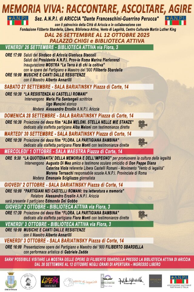Sono questi gli obiettivi che la Sezione A.N.P.I. di Ariccia insieme all’Archivio Filiberto Sbardella, a “Libera. Associazioni, nomi e numeri contro le mafie”, alla Biblioteca Attiva, a “Vento di Legalità” e al Centro Culturale “Martin Luther King”, si sono prefissati nell’organizzare la manifestazione “Memoria Viva: Raccontare, Ascoltare, Agire”, patrocinata dal comune di Ariccia.