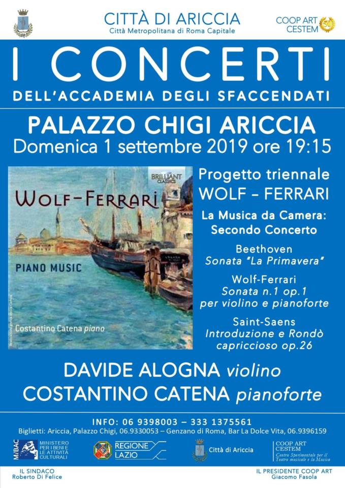 Domenica primo settembre, alle ore 19.15, nella Sala Maestra di Palazzo Chigi ad Ariccia si inaugura la Stagione Autunnale dei Concerti dell’Accademia degli Sfaccendati la prestigiosa rassegna musicale, sostenuta dal Comune di Ariccia e dal Ministero dei Beni e delle Attività Culturali, che ha in cartellone ben 18 appuntamenti di grande interesse ed altissima qualità artistica fino al 15 dicembre 2019. Per il concerto di inaugurazione Giovanna Manci e Giacomo Fasola, direttori artistici della Rassegna, hanno chiamato due straordinari musicisti attivi sulla scena internazionale, Davide Alogna e Costantino Catena, che porteranno avanti il Progetto Triennale dedicato alla registrazione in CD dell’integrale della musica da camera con pianoforte di Ermanno Wolf-Ferrari. Dopo lo straordinario successo mondiale riscosso dal primo CD, dedicato alle composizioni per pianoforte solo, che ha ricevuto recensioni entusiasmanti dalla critica specialistica internazionale (“Grandezza allo stato puro!” ha scritto Burkhard Schäfer sulla rivista tedesca PIANO NEWS), quest’anno verranno incise tutte le Sonate per violino e pianoforte del compositore italo-tedesco. Davide Alogna e Costantino Catena, che saranno impegnati nella realizzazione di questo secondo CD distribuito a livello internazionale sempre dall’etichetta olandese BRILLIANT CLASSICS, faranno ascoltare la prima Sonata per violino e pianoforte di Wolf-Ferrari insieme alla notissima Sonata “Primavera” di Beethoven e all’Introduzione e Rondò capriccioso di Saint-Saëns per questa inaugurazione dei Concerti d’Autunno che è proprio da non perdere.