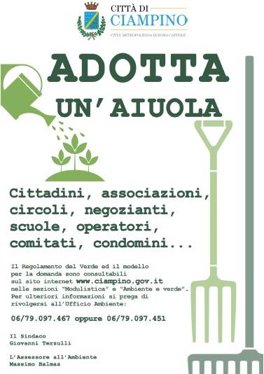 “Con questa iniziativa, che mira a migliorare la manutenzione delle numerose aree a verde presenti sul territorio comunale – hanno dichiarato il Sindaco di Ciampino, Giovanni Terzulli e l’Assessore all’Ambiente, Massimo Balmas – si vuole sensibilizzare ciascun cittadino, associazione o impresa, nella cura di un’area verde pubblica, nel rispetto del recente Regolamento comunale del verde, tramite affidamento in gestione e con la possibilità di apporre una targa con l’indicazione di chi si è fatto carico della manutenzione”.