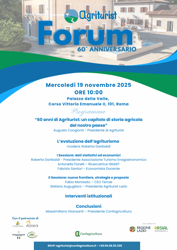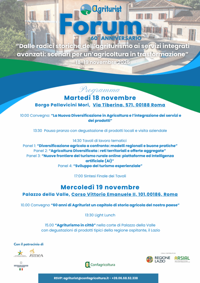 Mercoledì 19 novembre invece ci si trasferirà nella storica sede romana di Confagricoltura di Palazzo Della Valle, presso Corso Vittorio Emanuele II n 101, dove in mattinata si ripercorrerà la storia e l’evoluzione di Agriturist in Italia, aprendo gli orizzonti verso le nuove frontiere del comparto agrituristico, alla presenza tra gli altri del Presidente Nazionale di Confagricoltura Massimiliano Giansanti.