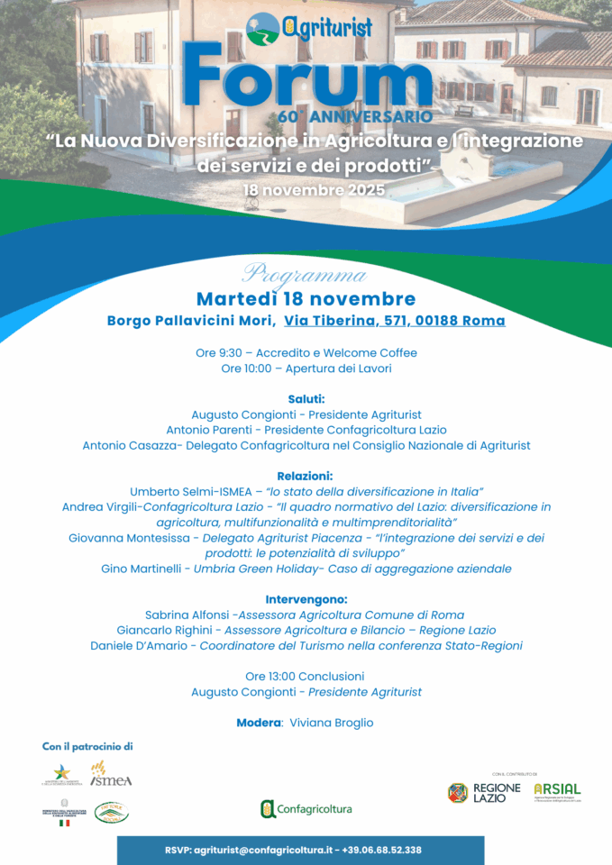 Si comincia martedì 18 novembre con il Forum: La Nuova Diversificazione in Agricoltura e l’Integrazione dei Servizi e dei Prodotti”, presso la storica Tenuta Borgo Pallavicini Mori, sita in via Tiberina 571 a Roma.