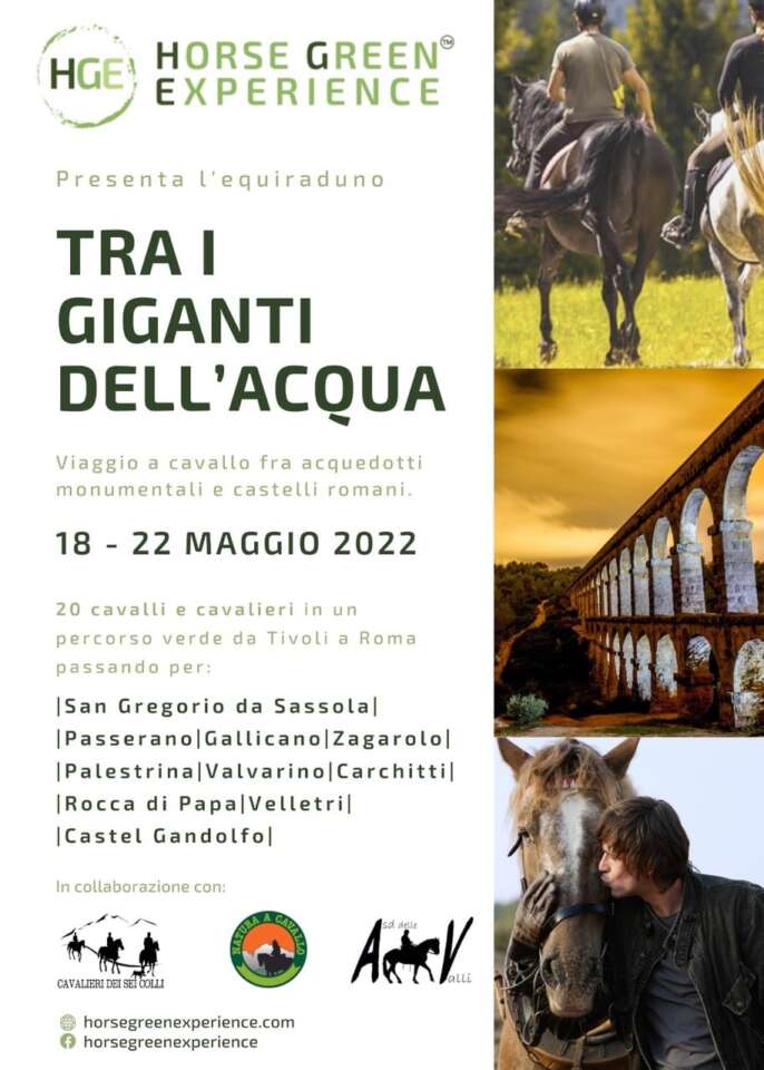 Un gruppo di 20 cavalli e cavalieri selezionati dalle Associazioni “Natura a Cavallo”, “Cavalieri dei Sei Colli” e “ASD delle Valli” effettuerà un viaggio a cavallo di 75 km. attraverso dieci Comuni della Città Metropolitana di Roma, partendo da Tivoli per giungere all’Ippodromo Capannelle. L’itinerario si snoderà tra gli acquedotti monumentali e i Castelli Romani, facendo tappa nei centri storici dei Comuni i cui Sindaci organizzeranno un saluto di benvenuto all’evento.