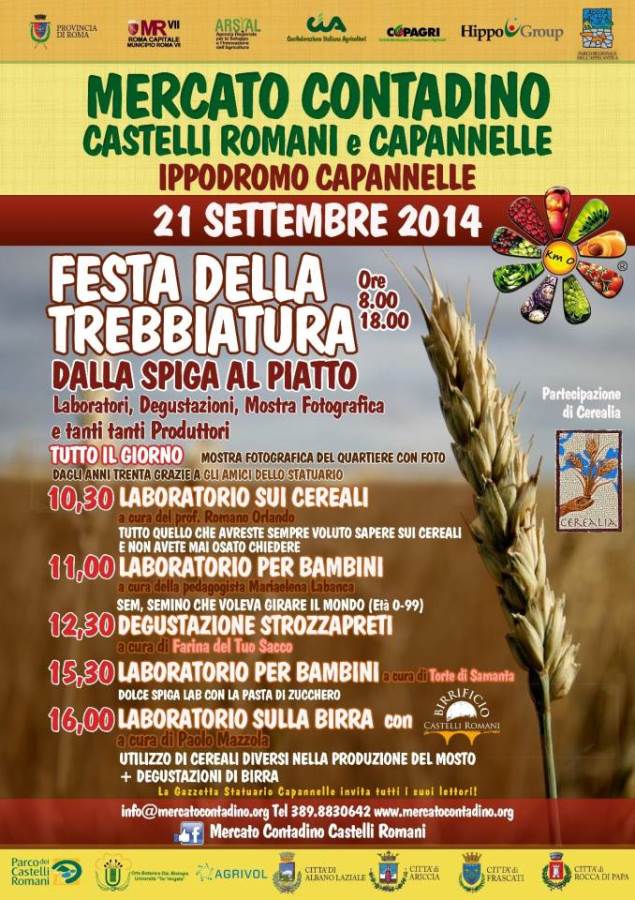 Non meravigliatevi se alle 8 di mattina, passando sulla via Appia, non vedrete, come tutte le domeniche di fronte all’Ippodromo, i tettini bianchi degli stands del Mercato Contadino Castelli Romani e Capannelle. Il mercato contadino ci sarà, anche domenica 21 settembre, eccome. Ma sarà una domenica speciale perché i produttori organizzeranno una bella “Festa della trebbiatura: dalla spiga al piatto” e la trentina di banchi dei contadini animeranno il piazzale all’interno di Capannelle – appena si entra – proprio sotto la struttura metallica che ha fatto esclamare a una consumatrice meravigliata: “…Sembra di stare a Parigi…..!”