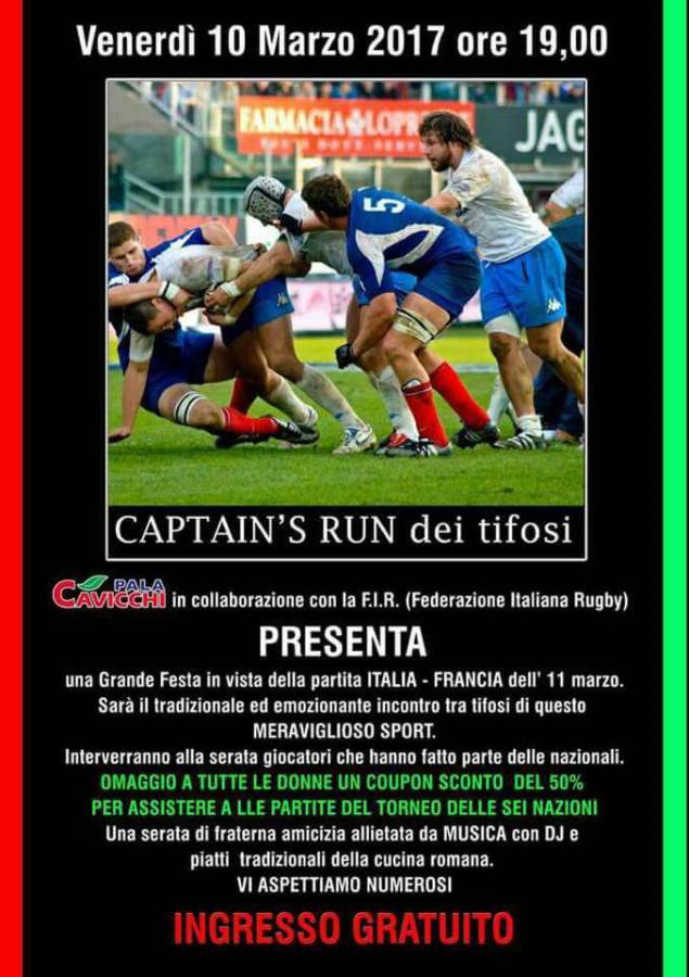 Dopo l’esperienza 2016 presso il Gasometro di Roma, il Pala Cavicchi ospita l’edizione 2017 del Captain’s Run dei tifosi. L’evento è organizzato in collaborazione con la Federazione Italiana Rugby. Quella che si prospetta come una grande festa alla vigilia di Italia-Francia, quarta partita del Sei Nazioni 2017, avrà luogo venerdì 10 marzo dalle ore 19:00 presso il Pala Cavicchi di Roma (che si trova a via Ranuccio Bianchi Bandinelli 130).