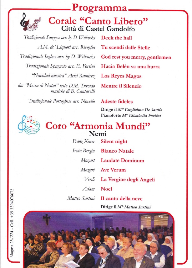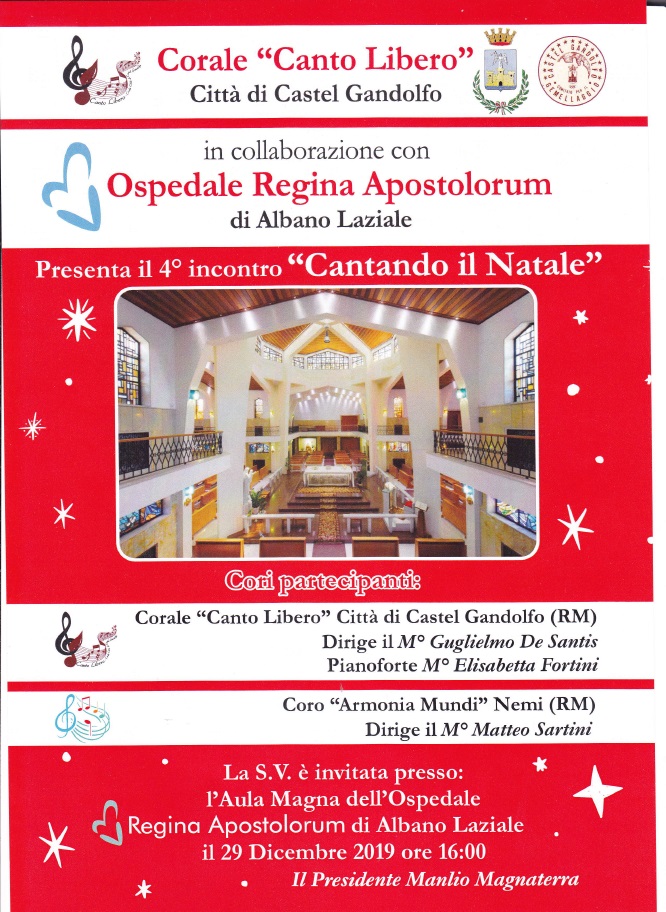 Domenica 29 dicembre alle ore 16 presso l’Aula Magna dell’Ospedale Regina Apostolorum di Albano il quarto appuntamento con Cantando il Natale: parteciperanno all’incontro la Corale Canto Libero della Città di Castel Gandolfo, diretta dal Maestro Guglielmo De Santis con al pianoforte Elisabetta Fortini e il Coro Armonia Mundi di Nemi diretto dal Maestro Matteo Sartini. All’inizio del Concerto si terrà un momento musicale francescano ad onore di San Pio da Pietrelcina-Padre Pio: un canto accompagnato da chitarra. Verrà presentato il dono della S.M.S. Bruno Pezzi all’Ospedale Regina Apostolorum: il mosaico raffigurante l’immagine di Padre Pio. L’opera è stata realizzata nell’anno scolastico 2005/2006, studiata ed elaborata dalle studentesse Marta Formosa e Martina Tomasello, sotto la supervisione artistica della professoressa Giulia Luparelli, insegnante di storia dell’arte presso l’Istituto. Sarà presente la signora Rosanna Pezzi, vedova del Professor Bruno Pezzi, già dirigente scolastico dell’Istituto.