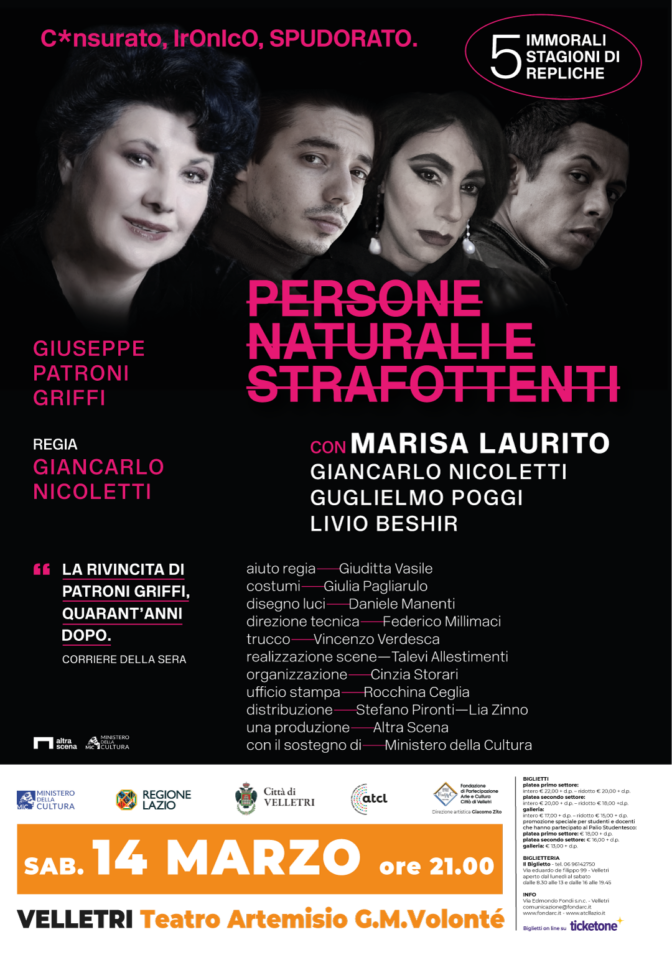 Dopo il sold out con “Lapocalisse” di Valerio Aprea, è tempo di un altro spettacolo in cartellone al Teatro Artemisio-Volonté nell’ambito della programmazione messa a punto dalla Fondarc, diretta da Giacomo Zito, in sinergia con Comune di Velletri e ATCL, Circuito Multidisciplinare del Lazio sostenuto da MIC – Ministero della Cultura e Regione Lazio. Sabato 14 marzo, alle ore 21, sullo storico palco veliterno “Persone naturali e strafottenti”, di Giuseppe Patroni Griffi, con Marisa Laurito, Giancarlo Nicoletti, Guglielmo Poggi, Livio Beshir per la regia di Giancarlo Nicoletti