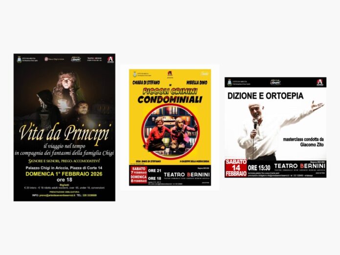 Prosegue spedita la programmazione culturale al Teatro Bernini di Ariccia – per la direzione artistica di Giacomo Zito e con il contributo economico del Comune di Ariccia, nell’ambito delle iniziative di “Ariccia da amare”. Il mese di febbraio 2026 offre un calendario ricco di eventi.