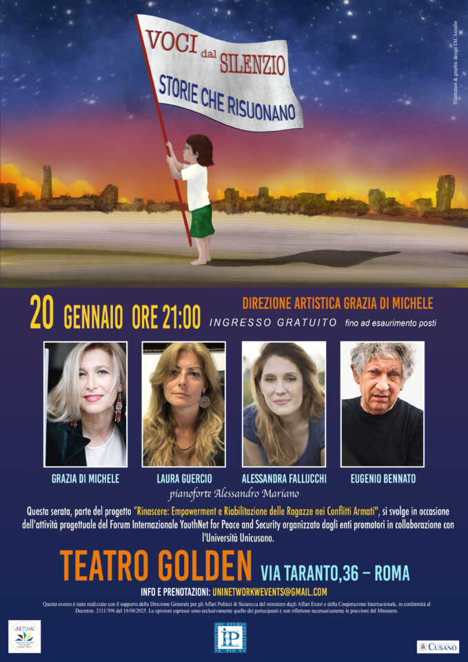 Un viaggio fatto di parole e suoni, tra le esperienze emotive di tante giovani donne sopravvissute in contesti di guerra, quello che si prepara a prendere vita sul palco del Teatro Golden per raccontare volti e storie di vita. E’ la mission del concerto teatrale e musicale “Voci nel Silenzio: Storie che Risuonano”, in scena il 20 gennaio 2026 con Grazia di Michele, che segue anche la direzione artistica, Laura Guercio, Alessandra Fallucchi, Eugenio Bennato, inserito nel contesto del progetto “Rinascere – Empowerment e Riabilitazione delle Ragazze nei Conflitti Armati”, supportato dal Ministero Affari Esteri e della Cooperazione italiana e promosso da Universities Network for Children in Armed Conflict, la prima rete accademica internazionale, lanciata nel novembre 2020, con l’obiettivo di rafforzare il ruolo della comunità accademica nella protezione dei bambini coinvolti direttamente e indirettamente nei conflitti armati, in collaborazione con l’Istituto di Studi Politici S. Pio V (uno dei soci fondatori del Network), nell’ambito dell’attuazione dell’Agenda Donne, Pace e Sicurezza, sancita dalla Risoluzione 1325 del Consiglio di Sicurezza delle Nazioni Unite e dalle successive risoluzioni che ne hanno ampliato il mandato.