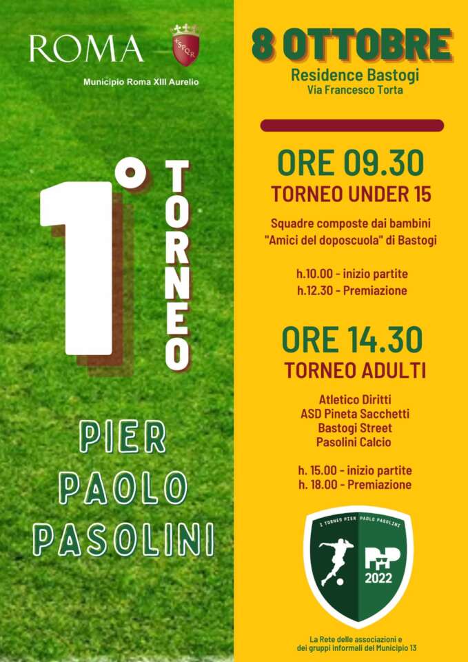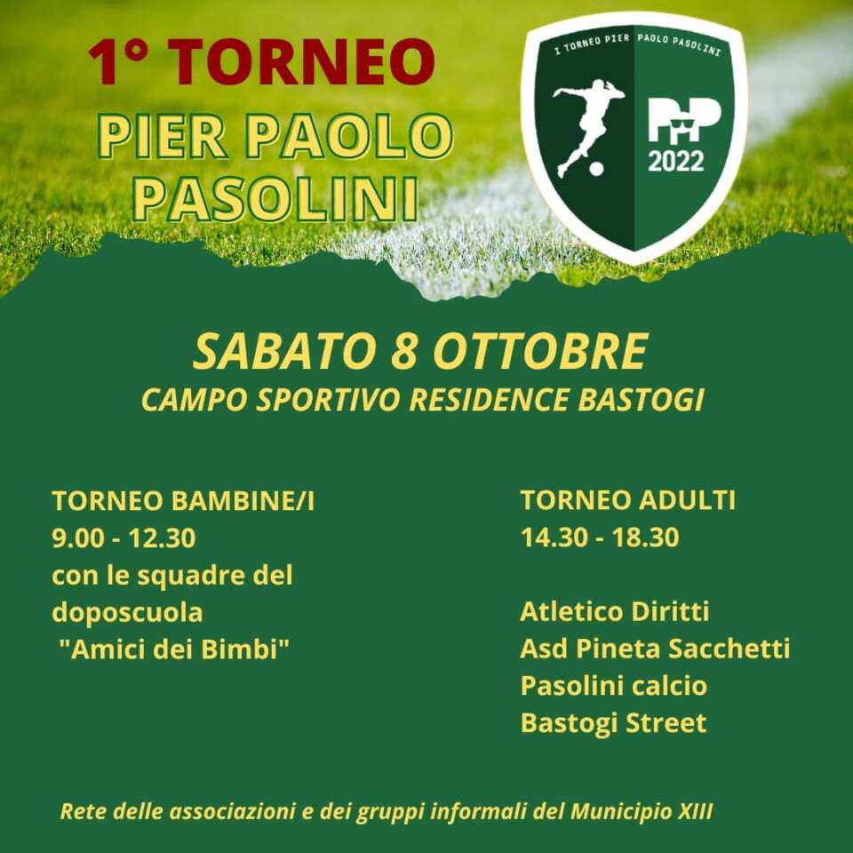 Sabato 8 ottobre, a partire dalle ore 10, presso il campo sportivo di Bastogi (in via Francesco Torta), situato nel quadrante Nord Ovest di Roma, si svolgerà il primo torneo di calcio popolare dedicato a Pier Paolo Pasolini. L’iniziativa è stata realizzata attraverso un percorso di collaborazione tra la “Rete dei gruppi informali e associazioni del Municipio XIII” e la Presidenza del Municipio XIII di Roma Capitale.