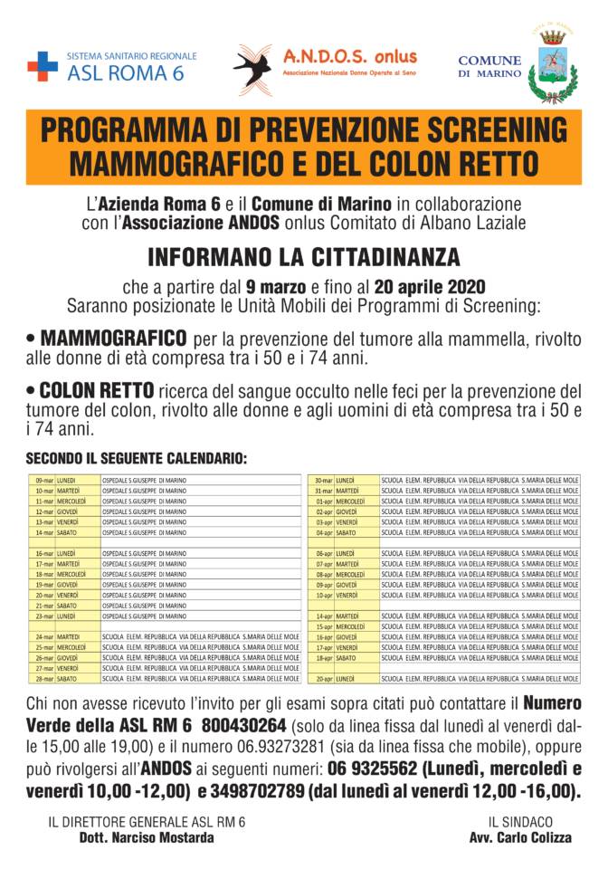 Partirà il 9 Marzo prossimo e proseguirà fino al 20 Aprile 2020 a Marino la campagna di prevenzione messa in campo dall’Azienda Sanitaria Locale Roma 6 in stretta sinergia con il Comune di Marino e con la collaborazione con l’Associazione Nazionale Donne Operate al Seno (A.N.D.O.S.) onlus. Due gli Screening che saranno attuati: il primo quello MAMMOGRAFICO per la prevenzione del tumore alla mammella rivolto alle donne di età compresa tra i 50 e i 74 anni; il secondo quello del COLON RETTO consistente nella ricerca del sangue occulto nelle feci per la prevenzione del tumore al colon, rivolto alle donne e agli uomini di età compresa tra i 50 e i 74 anni. Le Unità Mobili della ASL ROMA 6 saranno posizionate dentro l’area dell’Ospedale San Giuseppe di Marino dal 9 Marzo al 23 Marzo 2020 per gli abitanti di Marino centro e nell’area della Scuola elementare “REPUBBLICA” di Viale della Repubblica a Santa Maria delle Mole dal 24 Marzo al 20 Aprile 2020 per gli abitanti della pianura marinese, secondo il seguente calendario :