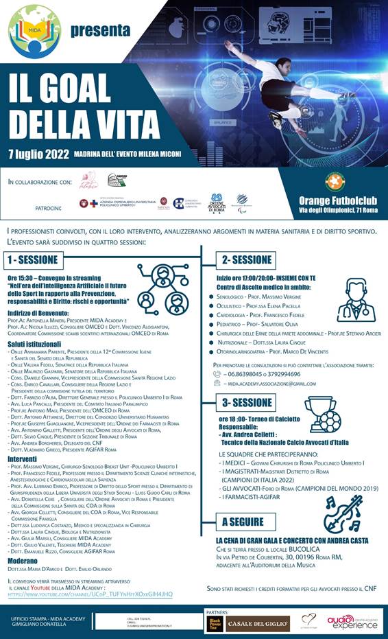 Al via “Il Goal per la Vita”, torneo di calcetto promosso da Mida Academy che il 7 luglio 2022 alle 18.00 all’Orange Futbolclub di Roma vedrà sfidarsi sul campo di calcio la squadra dei Magistrati Campioni d’Italia 2022 capitanata da Silvio Cinque, la squadra dei medici del Policlinico Umberto I, capitanata da Francesco Arcieri e Maria Ludovica Costanzo, e quelle degli Avvocati del Foro di Roma, già campioni del Mondo 2019, capitanata da Andrea Celletti e dei Farmacisti Agifar Roma, capitanata da Emanuele Rizzo.