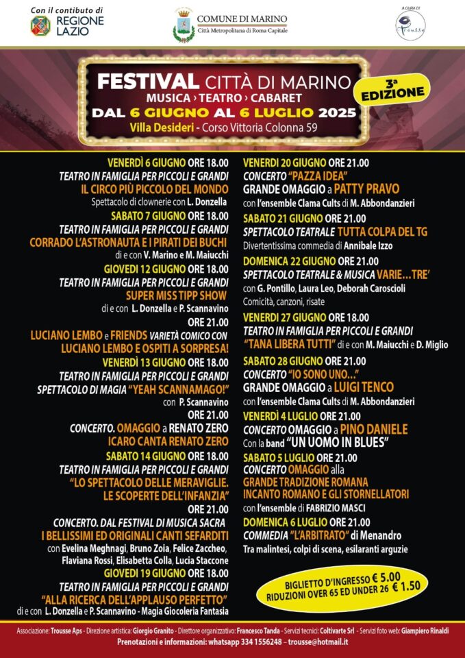 Avrà inizio il 6 giugno 2025 presso il Teatro “V. Colonna” di Marino la 3^ edizione del Festival Città di Marino, promosso dall’Associazione Trousse e dal Comune di Marino, con il contributo della Regione Lazio.