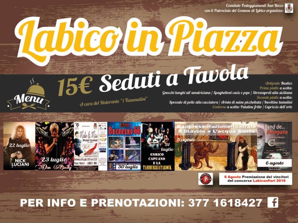 Da quattro anni il Comitato festeggiamenti San Rocco, presieduto da Angelo Fontana con il patrocinio del Comune di Labico guidato dal sindaco Alfredo Galli, propone agli abitanti del paese e a quanti riescono a raggiungerlo, spettacoli suggestivi al fine di allietare l’estate di chi in vacanza non può andare oppure di chi ha deciso di trascorrerla in questa zona.