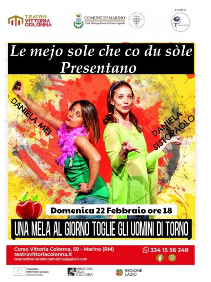 Al Teatro V. Colonna il 22 febbraio 2026 alle ore 18,00 andrà in scena “Una mela al giorno toglie gli uomini di torno” commedia di e con Daniela Mei e Daniela Sistopaolo, ovvero “Mejo sole che co du sòle”.