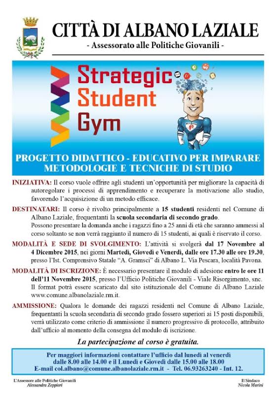 Si partirà, presso l’Istituto “A. Gramsci” di Pavona, con il progetto didattico-educativo “Strategic Student Gym” finalizzato ad insegnare metodologie e tecniche di studio. Dal 17 novembre lo stesso corso coinvolgerà gli studenti e le studentesse della Scuola secondaria di II grado; potranno partecipare anche i giovani fino ai 25 anni, qualora non venisse raggiunto il numero massimo di studenti partecipanti.
