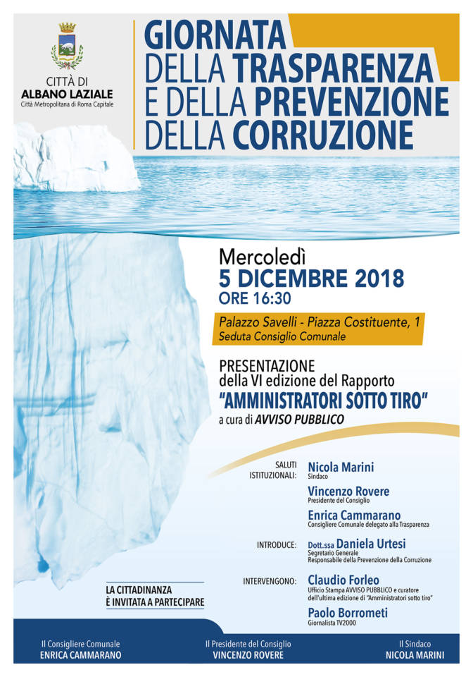 Mercoledì 5 dicembre, alle ore 16.30, a Palazzo Savelli (Piazza Costituente, 1 – Albano Laziale) si terrà la Giornata della Trasparenza e della Prevenzione della Corruzione a cura dell’Amministrazione Comunale di Albano Laziale. Durante l’iniziativa sarà presentata la VI^ edizione del rapporto “Amministratori sotto tiro” a cura dell’associazione Avviso Pubblico. A portare i saluti istituzionali saranno il Sindaco Nicola Marini, il Presidente del Consiglio Comunale Vincenzo Rovere e il Consigliere Comunale delegato alla Trasparenza Enrica Cammarano. Introdurrà la materia il Segretario Generale e Responsabile della Prevenzione della Corruzione del Comune di Albano Laziale, Dottoressa Daniela Urtesi. Interverranno l’Ufficio Stampa dell’associazione Avviso Pubblico e curatore dell’ultima edizione di “Amministratori sotto tiro”, Claudio Forleo, e il giornalista di TV2000, Paolo Borrometi.