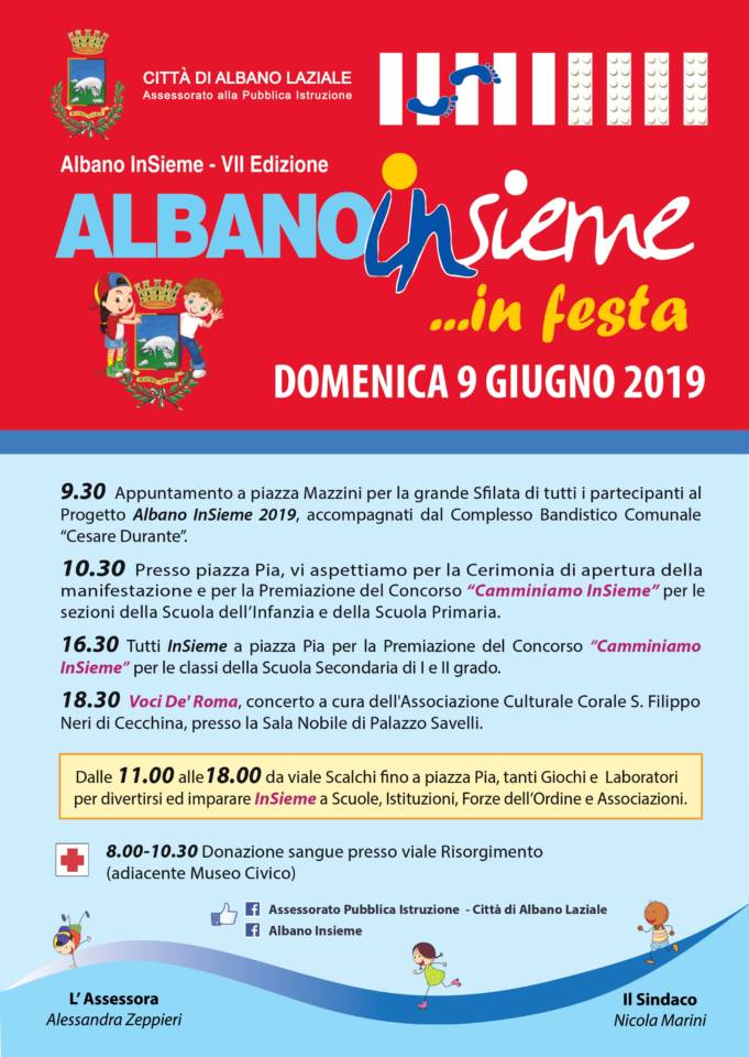 Domenica 9 giugno il centro storico di Albano Laziale sarà attraversato dalla manifestazione “Albano InSieme …in Festa!”, giornata finale del progetto “Albano InSieme”, organizzato dall’Assessorato alla Pubblica Istruzione e giunto quest’anno alla settima edizione.