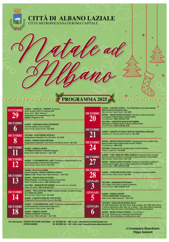 “Albano Laziale si prepara a vivere il periodo più magico dell’anno con un programma ricco e variegato, pensato per far sorridere e stupire cittadini e visitatori. Dal 29 novembre 2025 al 10 gennaio 2026, il centro storico e le circoscrizioni di Cecchina e Pavona si trasformeranno in un grande palcoscenico di festa, con spettacoli, concerti, laboratori, presepi e iniziative culturali dedicate a grandi e piccini.