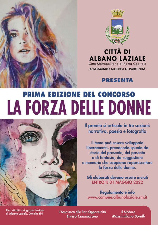 Ripartire dalle parole e dal loro significato per celebrare, raccontare, descrivere la forza delle donne, non solo il 25 novembre ma durante ogni giorno dell’anno. L’assessorato alle Pari Opportunità della Città di Albano Laziale ha bandito la prima edizione del concorso letterario nazionale “La forza delle donne”, articolato in tre sezioni: racconto breve, poesia e fotografia.
