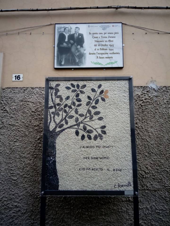 Il Sindaco Nicola Marini ha inaugurato questa mattina (mercoledì 29 maggio ndr) una targa e il mosaico “L’Albero dei Giusti”, realizzato dall’artista Claudia Romanelli, in memoria di Cesare e Teresa Durante, due cittadini di Albano Laziale che nel terribile periodo della Shoah riuscirono a nascondere e a proteggere a casa propria 22 ebrei dal 16 ottobre 1943 al 10 febbraio 1944. La targa e il mosaico sono stati posizionati presso l’edificio dove i coniugi risiedevano. Hanno presenziato alla commemorazione il Presidente dell’Associazione “Famigliari Vittime dei Bombardamenti di Propaganda Fide”, Ada Scalchi, co-organizzatrice dell’iniziativa; Yael Franzone in rappresentanza della Comunità Ebraica; Sergio Durante figlio di Cesare e Teresa; Rina e Lina Pavoncelli che furono ospitate dalla famiglia Durante; il Preside del Liceo Classico “Ugo Foscolo”, Lucio Mariani, con cui l’Amministrazione Comunale organizza il Viaggio della Memoria. Il primo cittadino prima dell’inaugurazione, di fronte agli studenti delle scuole superiori del territorio, ha commentato: «È importante che stamattina ci siano anche i ragazzi, perché rappresentano il futuro. Esistono uomini determinati e profondamente convinti delle loro idee, che quotidianamente fanno piccole ma dirompenti atti che poi assumono il sapore dell’atto eroico. Cesare e Teresa Durante con il coraggio e la determinazione hanno compiuto gesti eroici da uomini normali, da uomini che basano la propria esistenza su due unici valori: l’uguaglianza e la giustizia. Perché non c’è nulla di più straordinario – ha concluso il Sindaco Nicola Marini – di rispondere a momenti storici cupi, con piccoli ma dirompenti atti, atti giusti e profondi, atti di vita, atti di unione, atti di uguaglianza».