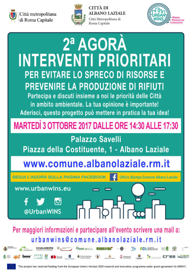 Martedì 3 ottobre, dalle ore 14.30 alle ore 17.30, presso Palazzo Savelli in Piazza della Costituente, 1 , si terrà il secondo incontro pubblico (Agorà Face to Face) del progetto europeo Urban Wins, al quale il Comune di Albano Laziale partecipa in qualità di Città Pilota. L’iniziativa, finanziata dal Programma Ricerca e Innovazione Horizon2020, si prefigge l’obiettivo di progettare e implementare piani strategici, innovativi e sostenibili per la riduzione e la gestione dei rifiuti in vari contesti urbani. Al progetto partecipano partner di sette Paesi diversi (Italia, Germania, Spagna, Portogallo, Romania, Svezia e Austria). La Città Metropolitana di Roma Capitale è tra i nove partener italiani, insieme a varie Università, Istituzioni e Fondazioni. Oltre ad Albano Laziale, sono coinvolte altre sette città europee: Cremona, Pomezia, Torino, Bucarest, Leiria, Sabadell e Manresa. Durante l’Agorà di martedì prossimo si incontreranno cittadini, imprenditori, liberi professionisti e mondo dell’associazionismo e tutti gli stakeholder del territorio che diranno la loro opinione su tematiche inerenti la gestione e il ciclo dei rifiuti. Pertanto sarà promosso ed incoraggiato il confronto per creare soluzioni e promuovere schemi di consumo e produzione più sostenibili. All’Agorà di martedì prossimo, ne seguiranno altre sino alla scadenza del progetto, prevista per giugno 2019, attraverso le quali gli stakeholder potranno esprimere la loro opinione sulle tematiche inerenti la gestione e il ciclo dei rifiuti.
