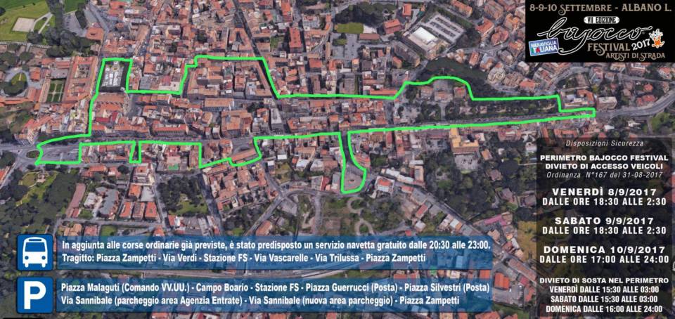 In occasione del Bajocco Festival, che prende il via stasera, venerdì 8 settembre, e che proseguirà per l’intero weekend, in aggiunta all’ordinario servizio di Trasporto Pubblico Locale, l’Assessorato ai Trasporti ha predisposto un servizio di navetta gratuita a partire dalle ore 20.30 alle 23. Le fermate saranno Piazza Zampetti, Via Verdi, Stazione FS Albano Laziale, Via Vascarelle, Via Trilussa, Piazza Zampetti. L’Assessore ai Trasporti, Stefania Cavalieri, ha commentato: «Per facilitare l’interscambio con i parcheggi e le aree limitrofe al centro città, da parte dei cittadini, abbiamo istituito questo servizio che si va ad aggiungere alle corse ordinarie. Il tutto per godere a pieno dei quasi duecento spettacoli gratuiti degli artisti di strada che animeranno il centro città».