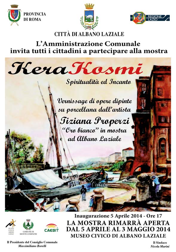 Sabato 5 Aprile p.v nella cornice del Museo Civico di Albano Laziale alle ore 18 ci sarà l’inaugurazione della Mostra “Kerakosmi spiritualità e incanto”, introdotta dal professor Ugo Onorati. La mostra promossa dall’Amministrazione Comunale, vedrà esposte le opere dell’artista Tiziana Properzi, una delle più importanti rappresentanti della tecnica di pittura su porcellana. Il vernissage delle opere sarà esposto al Museo Civico fino a sabato 3 maggio.