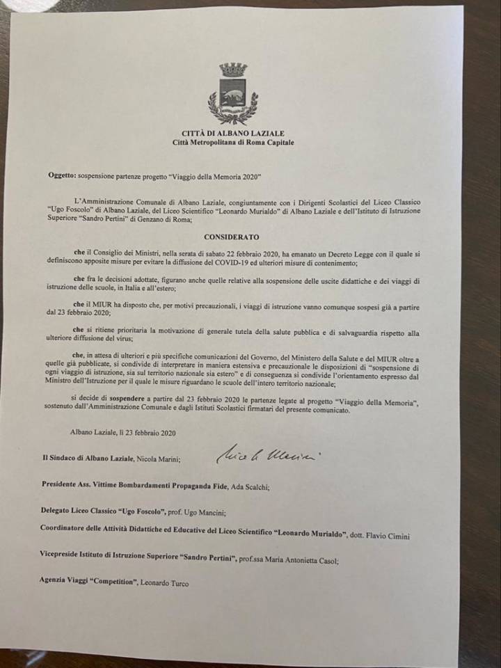 L’Amministrazione Comunale di Albano Laziale, congiuntamente con i Dirigenti Scolastici del Liceo Classico “Ugo Foscolo” di Albano Laziale, del Liceo Scientifico “Leonardo Murialdo” di Albano Laziale e dell’Istituto di Istruzione Superiore “Sandro Pertini” di Genzano di Roma, ha deciso di sospendere a partire dal 23 febbraio 2020 le partenze legate al progetto “Viaggio della Memoria”. La decisione è scaturita dalla necessità di tutelare la salute pubblica, alla luce del Decreto Legge emanato dal Consiglio dei Ministri, con il quale si definiscono apposite misure per evitare la diffusione del COVID-19, e dalla decisione del MIUR di sospendere le uscite didattiche e dei viaggi di istruzione delle scuole, in Italia e all’estero.