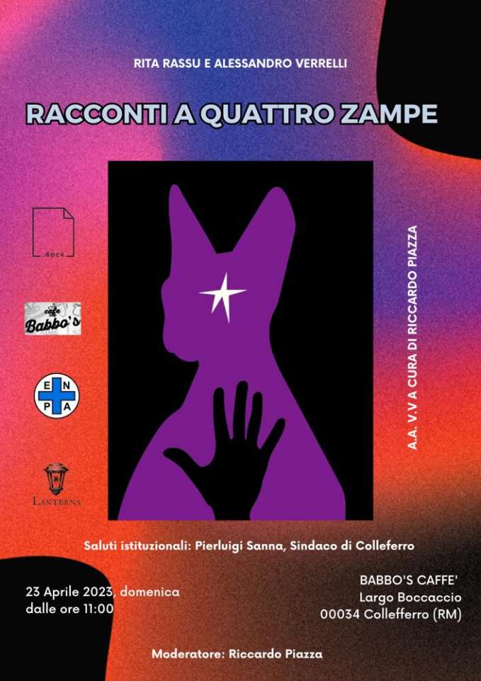 “Senza spazio né tempo” è il nuovo racconto scritto a quattro mani da Alessandro Verrelli e Rita Rassu. Racchiuso nell’antologia “Racconti a quattro zampe”, a cura di Riccardo Piazza ed edito da “Affiori”, verrà presentato domenica 23 aprile a Colleferro. A portare i saluti e ad aprire la manifestazione il sindaco della città Pierluigi Sanna.