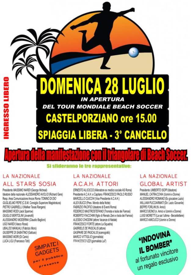 Domenica 28 luglio Ostia sarà protagonista delle finali della tappa del tour mondiale del beach soccer. A fare da aperitivo al torneo calcistico su spiaggia il triangolare benefico, che inizierà alle ore 15:00, tra la Nazionale A.C.A.H. E Attori P.N.W., composta da associati di All Cops Are Heroes, di Play Night World e da alcuni famosi attori, guidati dal Presidente Francesco Paolo Russo. Le altre due squadre che parteciperanno all’iniziativa sono la Nazionale All Stars Sosia e la Global Artist.