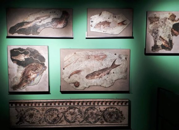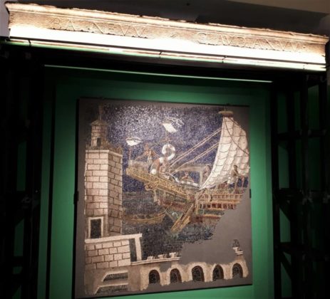 “L’arte del mosaico presso i romani. La storia e la tecnica” (la prima sezione, dal colore rosso, con la storia dell’arte del mosaico); “Vivere e abitare a Roma tra la fine dell’età repubblicana e l’età tardo-antica: le dimore di lusso e i contesti domestici” (la seconda, contraddistinta dal colore verde, con i mosaici provenienti dalle dimore di lusso. A farla da padrone, uno straordinario mosaico parietale con la partenza di una nave dal porto, ornamento di una domus che sorgeva sul Quirinale e la cui ricchezza è ripercorsa, per l’occasione, con sculture e preziosi oggetti di arredo, esposti per la prima volta). Quindi, “Gli spazi del sacro: la basilica Hilariana” (la terza sezione, con il colore celeste, e la sede del collegio dei sacerdoti addetti al culto di Cibele e Attis, nonché la memoria del ricco mercante di perle – Hilarius – che sostenne gli oneri finanziari per la costruzione della basilica, dandole il nome) e “I mosaici degli edifici funerari nelle necropoli del suburbio di Roma” (la quarta e ultima, con il suo giallo tenue, e il repertorio sepolcrale che esalta le qualità del defunto, rievocando i valori collettivi della società romana. Il mosaico ottagonale con pavoni è un esempio emblematico di un motivo sì decorativo ma anche ricco di significato: uccello sacro a Dioniso, lo splendido uccello allude alla rigenerazione oltre la morte).