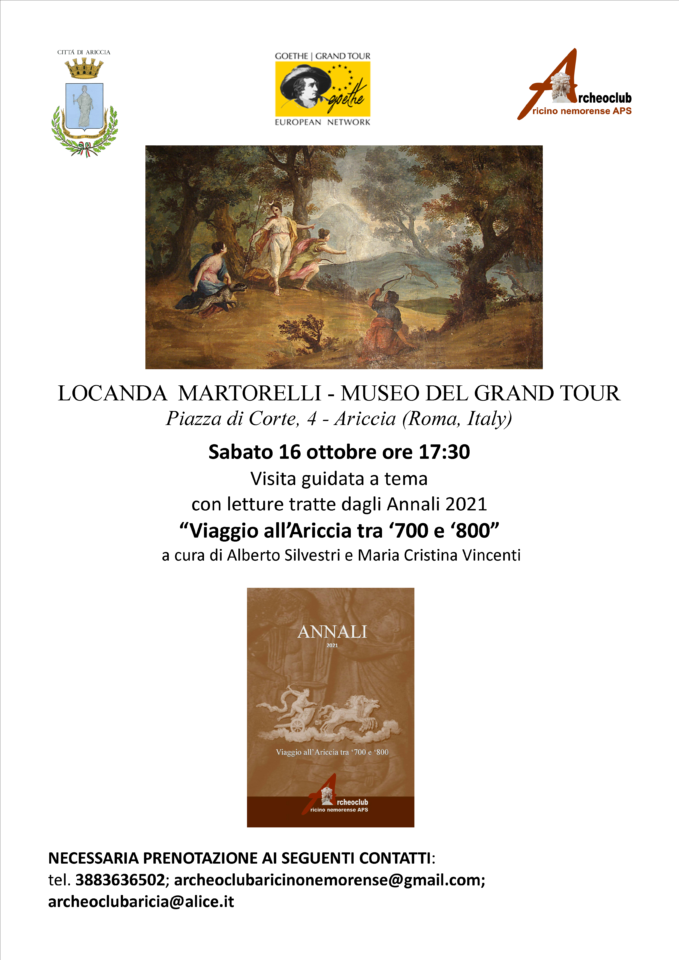 “Sabato 16 settembre alle ore 17:30 si svolgerà presso la Locanda Martorelli-Museo del Grand Tour una interessante visita guidata a tema con letture tratte dagli Annali 2021 “Viaggio all’Ariccia tra ‘700 e ‘800”, il nuovo fascicolo degli Annali di Archeoclub Aricino Nemorense APS, a cura di Alberto Silvestri e Maria Cristina Vincenti.