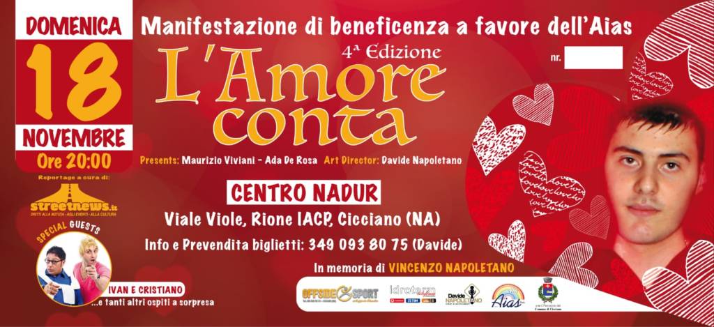 A Cicciano (Napoli) torna, come di consueto, l’appuntamento con la solidarietà con la manifestazione “L’Amore conta!”, evento di beneficenza giunto alla IV Edizione. A fare da protagonista sarà, come sempre, la solidarietà e stavolta l’incasso, tolte le spese di organizzazione, sarà devoluto all’ AIL ( Associazione italiana contro le leucemie-linfomi e mieloma ) della sede di Napoli. L’obiettivo fondamentale della manifestazione è infatti proprio quello di dare sostegno a chi è più in difficoltà, attraverso iniziative che, volte all’impegno sociale, appoggiano cause giuste. Questo il desiderio di Vincenzo Napoletano, un promettente pallavolista prematuramente scomparso all’età di 19 anni, a causa di una malattia, fratello di Davide, che è ideatore ed organizzatore dell’evento. Un modo per onorarne la memoria e realizzare il desiderio di colui che combatteva, infondendo e trasmettendo coraggio al prossimo e facendo passare il messaggio di non abbattersi mai nella vita. Vincenzo, caratterialmente solare, regalava sorrisi a chiunque ed ha dimostrato una grande forza d’animo, davvero ammirevole. “L’Amore conta!” avrà luogo domenica 18 novembre 2018 alle ore 20:00 presso il “Teatro Nadur“ di Cicciano. La conduzione della serata sarà affidata a Ada De Rosa e Maurizio Viviani. Numerosi gli ospiti che calcheranno la scena, per esprimere il loro talento attraverso le loro esibizioni. Fra gli artisti, saliranno sul palco Oscar Di Maio e la sua compagnia, Angelo Di Gennaro, Ivan e Cristiano, Myky Petillo, Antonio Ciccone e tanti altri. Seguirà, quindi, un’asta di beneficenza e verranno distribuiti gadget a tutti i presenti. Reportage e riprese video a cura dell’immancabile redazione di “StreetNews“. L’evento è sostenuto dall’Associazione “Amici a 4 zampe “ e l’Agenzia di animazione “Wake Up Animation“; vari gli sponsor intervenuti come “Offside Sport“, “Idroterm Telefonia“ e diversi imprenditori di Cicciano, che hanno conferito il loro prezioso supporto per consentire la realizzazione dell’iniziativa. Molto toccante la dichiarazione rilasciata da Davide, che anche quest’anno si appresta a dar vita ad uno spettacolo davvero speciale: “Questa serata mi fa rivivere in maniera particolare mio fratello. In realtà lo sento sempre vicino a me, credo che gli Angeli esistano“. Anche in questa edizione 2018 le luci del teatro brilleranno più del solito, affinchè l’afflato delle emozioni possa giungere sino ai confini stellati. —