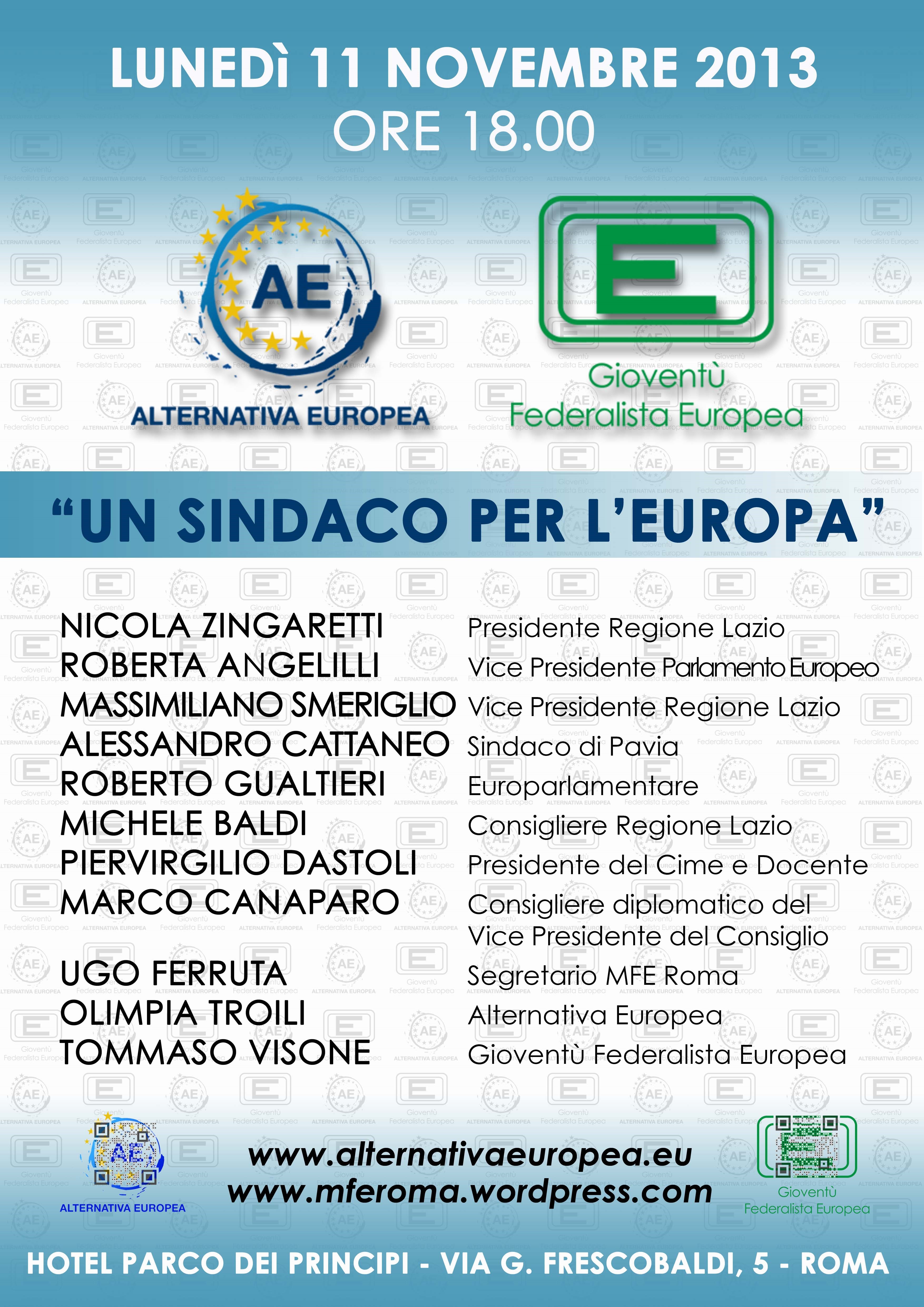 APPUNTAMENTI – Lunedì 11 novembre alle ore 18.00 l’Associazione Alternativa Europea, in collaborazione con la sezione romana di Gioventù Federalista Europea, lancerà l’appello “Un sindaco per l’Europa” durante il convegno che si terrà presso l’Hotel Parco dei Principi di Roma. Nella prossima primavera, infatti, in occasione delle elezioni per il rinnovo dell’Europarlamento, i partiti politici degli stati membri, come da raccomandazione della Commissione Europea, avranno la possibilità di indicare il loro candidato alla Presidenza della Commissione stessa prima del voto. L’Associazione Alternativa Europea, accogliendo queste indicazioni, intende avviare una campagna di sensibilizzazione dei gruppi politici europei e dell’opinione pubblica, che prenderà il via con l’appuntamento dell’11 novembre, affinché l’appello “Un sindaco per l’Europa” diventi realtà. La proposta, introdotta da Federico Castiglioni, verrà presentata da Olimpia Troili (Presidente di Alternativa Europea) e Tommaso Visone (Presidente Gioventù Federalista Europea – sezione di Roma). Ne dibatteranno, moderati da Giampiero Gramaglia de “Il Fatto Quotidiano”, Roberta Angelilli, Vice Presidente Parlamento Europeo, Massimiliano Smeriglio, Vice Presidente Regione Lazio, Roberto Gualtieri, Europarlamentare, Raffaele Cattaneo, Sindaco di Pavia, Piervirgilio Dastoli, docente universitario e Presidente CIME. La proposta ha incontrato anche il sostegno del Presidente della Regione Lazio, Nicola Zingaretti, che interverrà all’evento insieme a Michele Baldi, Consigliere Regionale, Marco Canaparo, consulente diplomatico per gli affari UE presso la Presidenza del Consiglio dei ministri, Giuseppe Failla, portavoce Forum