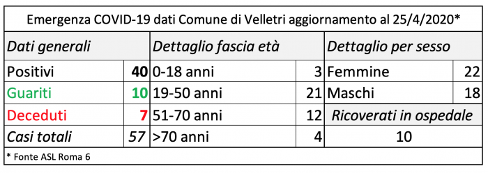 La celebrazione della Festa della Liberazione ci ricorda l’importanza della Libertà, con una cerimonia formale all’altare della Patria ricordo, a nome di tutta la Città, l’anniversario della fine della Seconda Guerra Mondiale. Purtroppo, non ci possiamo incontrare come succede tutti gli anni, puoi seguire su Facebook sulla pagina del Comune di Velletri. La criticità che ha investito le strutture sanitarie private del territorio si sta riflettendo anche su Velletri, ieri la ASL ci ha comunicato la presenza di quattro nuovi casi positivi, tutti operatori sanitari che lavorano in strutture private. Una pessima notizia che ci deve far comprendere, ancora di più, che l’epidemia non è finita e che è necessario prestare la massima attenzione. La tabella con il riepilogo dell’epidemia a Velletri: