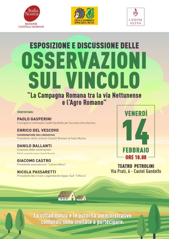 Recentemente la Soprintendenza (MIBAC, ministero per i beni e le attività culturali) ha posto un vincolo per la protezione del paesaggio su una vasta area di pregio compresa tra i comuni di Castel Gandolfo, Marino ed Albano allo scopo di evitare ulteriore consumo del suolo a causa della cementificazione imperante. Tale vincolo, detto “La Campagna Romana tra la via Nettunense e l’Agro Romano”, chiaramente lede gli interessi di quelle imprese che intendono realizzare i loro progetti di edificazione e pertanto è oggetto di agguerrita opposizione ed osservazioni contrarie. La sezione Castelli Romani di Italia Nostra, il partito Comunista sezione Castelli Romani, il circolo Legambiente Appia Sud “Il Riccio”, il comitato di quartiere Pavona1, l’associazione Latium Vetus ed altri comitati di cittadini hanno invece presentato proprie osservazioni sia a difesa del vincolo, che allo scopo di chiederne l’ampliamento, ritenendo necessario proteggere anche altre aree come S. Palomba e Monte Savello ( tra Roma ed Albano) che sono oggetto di speculazione edilizia, analogamente ad aree in buona parte ubicate anche nel territorio di Castel Gandolfo. Inoltre sono state raccolte anche svariate centinaia di firme a sostegno del vincolo grazie all’impegno del consigliere comunale Paolo Gasperini di Castel Gandolfo.