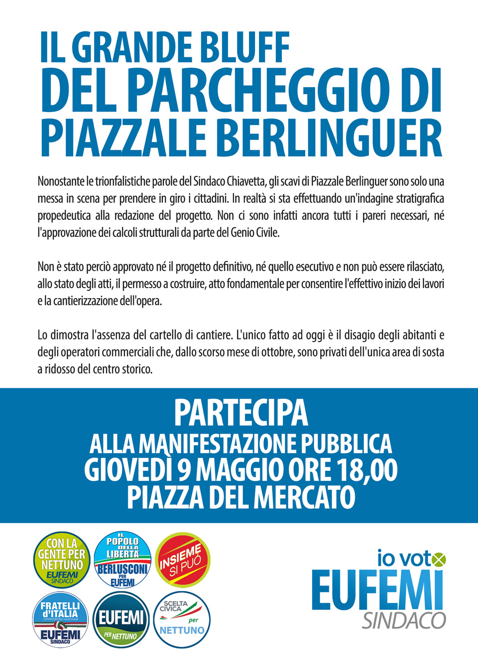 P.S. L’Ufficio stampa invita alla partecipazione “alla manifestazione pubblica che si terrà oggi, giovedì 9 maggio, alle ore 18 in piazza del Mercato.”