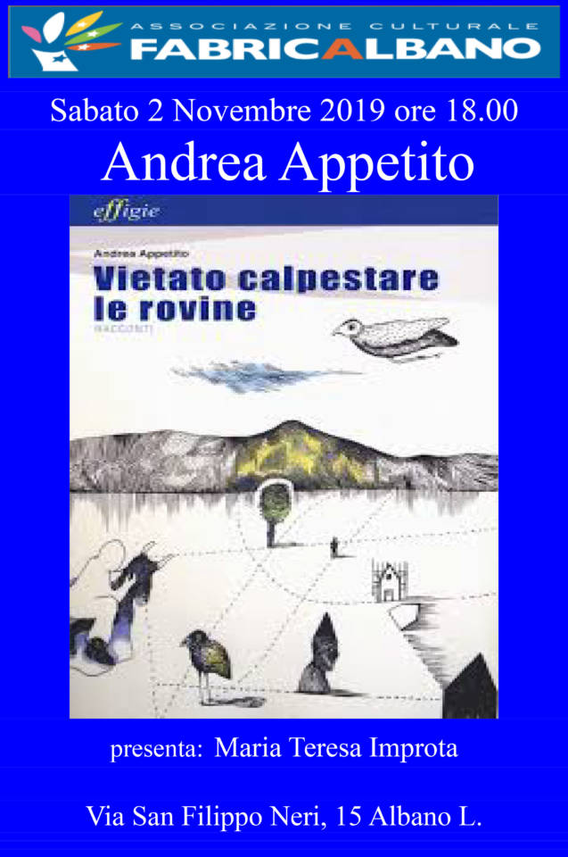 Continuano gli appuntamenti di approfondimento e confronto culturale ad Albano Laziale, promossi dall’associazione FabbricAlbano. Sabato 2 Novembre a partire dalle ore 18:00, presso i locali di via San Filippo Neri 15, sarà ospitato Andrea Appetito. Per l’occasione sarà presentato e discusso il suo libro Vietato Calpestare le Rovine. A condurre la serata sarà Maria Teresa Improta.
