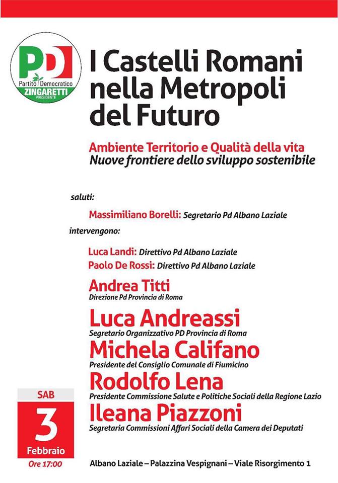 ‘I Castelli Romani nella Metropoli del Futuro: Ambiente, Territorio e Qualità della Vita – Nuove Frontiere dello Sviluppo Sostenibile’: è il titolo del convegno che si terrà ad Albano Laziale il prossimo sabato 3 febbraio alle 17 presso la Palazzina Vespignani in Viale Risorgimento 1. Oltre al Segretario Organizzativo del Partito Democratico della Provincia di Roma e Consigliere Comunale di Albano Luca Andreassi, con delega ai rifiuti, interverranno Ileana Piazzoni, candidata al collegio uninominale della Camera e Segretaria uscente della Commissione Affari Sociali di Montecitorio. Ci saranno, inoltre, Rodolfo Lena, Presidente della Commissione Politiche Sociali e Salute della Regione Lazio e Michela Califano, Presidente del Consiglio Comunale di Fiumicino, entrambi candidati alle elezioni regionali nella lista del Partito Democratico a sostegno di Nicola Zingaretti. All’evento porterà il suo saluto anche Massimiliano Borelli, Segretario del Partito Democratico di Albano Laziale. “In questa campagna elettorale in cui siamo travolti da promesse irrealizzabili e poco credibili – dichiara Luca Andreassi – noi continuiamo a credere che la buona politica debba partire dalle persone e dal territorio. Per questo motivo sabato presenteremo ai cittadini della nostra città i candidati che io sostengo, che hanno già dato prova di serietà e capacità nelle istituzioni, sia in Regione Lazio che alla Camera che nelle loro città. Insieme a molte realtà del nostro territorio, singoli cittadini e militanti, ragioneremo insieme sulle prospettive e sulle idee da mettere in campo per migliorare la qualità della vita nei nostri Castelli”.