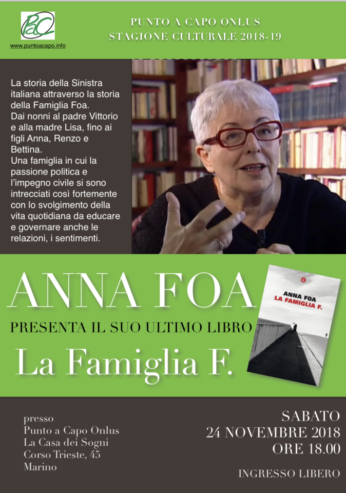 “È con enorme piacere – si legge in una nota degli organizzatori – che Punto a Capo Onlus torna ad ospitare Anna Foa, storica, scrittrice e amica, che stavolta ci parlerà del suo ultimo libro che ripercorre la storia della sua famiglia, la Famiglia Foa, che ha visto un percorso di vita parallelo a quello della Sinistra italiana, sabato 24 novembre 2018 alle 18.00 presso la nostra sede, La Casa dei Sogni, Corso Trieste, 45 a Marino”.
