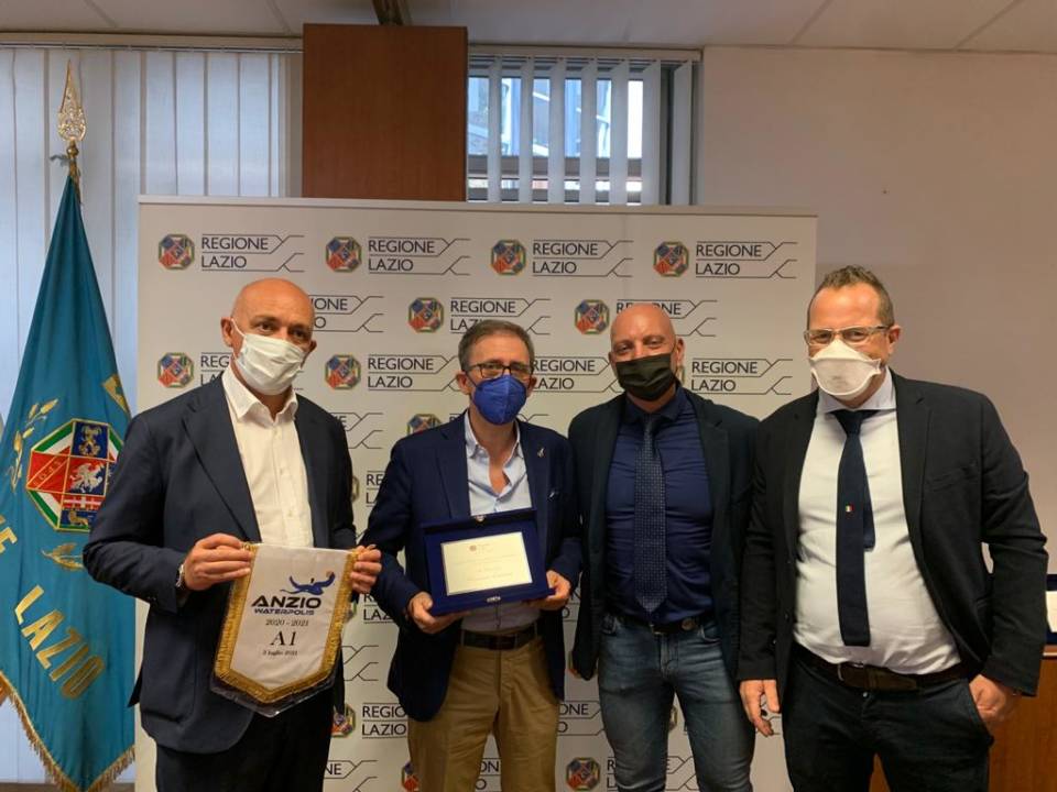 Il Vicepresidente della Regione Lazio Daniele Leodori, il Consigliere regionale Fabio Capolei, nato e cresciuto ad Anzio, e il Delegato allo Sport del Comune di Anzio, Massimo Millaci, hanno premiato con targhe e medaglie il dott. Francesco Damiani, Presidente del club di pallanuoto, Massimo Baccini dirigente amministrativo, Roberto Tofani, coach, e Fabio Sarti, preparatore atletico, in una cerimonia che si è svolta nel pieno rispetto delle norme anti Covid-19.