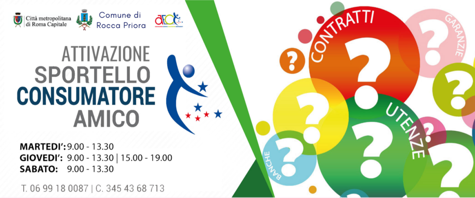 A Rocca Priora ha aperto lo Sportello Consumatore Amico a cui i cittadini di Rocca Priora possono rivolgersi per avere informazioni e risolvere piccoli e grandi problemi, come assistenza e tutela con le utenze di telefono, acqua, gas ed energia elettrica, pubblicità ingannevoli, televendite o acquisti online che non sono andati a buon fine. Lo Sportello è aperto in collaborazione con A.E.C.I. LAZIO, Associazione di Consumatori, e finanziato dal Comune di Rocca Priora e dalla Città Metropolitana di Roma Capitale.