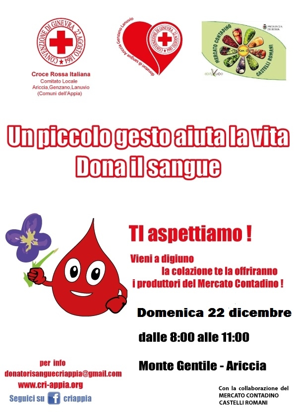 Domenica 22 dicembre sarà una domenica imperdibile: ad Ariccia dalle ore 8,00 grazie alla Croce Rossa Italiana sarà possibile donare il sangue, presentandosi a digiuno. La colazione ai donatori la offriranno i contadini con frutta appena raccolta, pane fragrante lievitato naturalmente con il lievito madre, formaggi e biscotti natalizi!