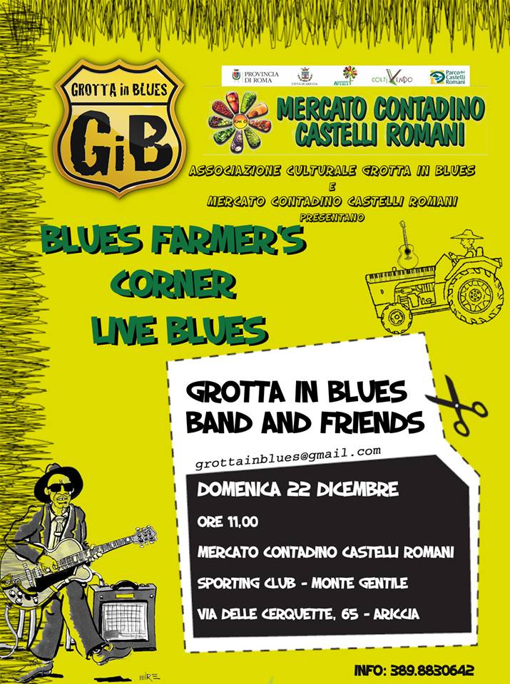 Dalle ore 11, il gruppo Grotta ‘n blues animerà il Mercato Contadino Castelli Romani con musica dal vivo. Aspettando il Natale la spesa sarà ancora più “gustosa” con la musica,il racconto dei contadini, lo scambio di ricette, la passeggiata sulla Via Sacra ed il parco giochi per i bambini. Il parco dello Sporting Club Monte Gentile si animerà come il mercato di Maxwell Street di Chicago che vide la nascita del blues elettrico. I musicisti neri emigrati nella Windy City iniziarono a suonare le proprie chitarre acustiche proprio al mercato, dove potevano essere ascoltati da un gran numero di persone. Ma i mercati, si sa, non sono luoghi silenziosi e quindi fu necessario amplificare le chitarre. È la nascita del Chicago Blues. Erano i negozi ai bordi della strada a fornire la corrente elettrica ai musicisti, sperando in questo modo di attirare un maggior numero di clienti. Artisti come Muddy Waters, Bo Diddley, Buddy Guy, Sonny Boy Williamson, Otis Rush, solo per citarne alcuni, hanno mosso i primi passi proprio tra i banchi di quel mercato .