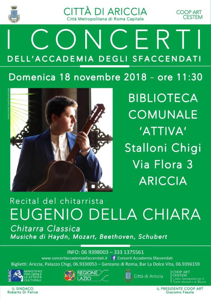 I Concerti dell’Accademia degli Sfaccendati al Palazzo Chigi di Ariccia sono realizzati dalla COOP ART con il patrocinio e il contributo del Comune di Ariccia , del Ministero dei Beni e delle Attività Culturali e della Regione Lazio.
