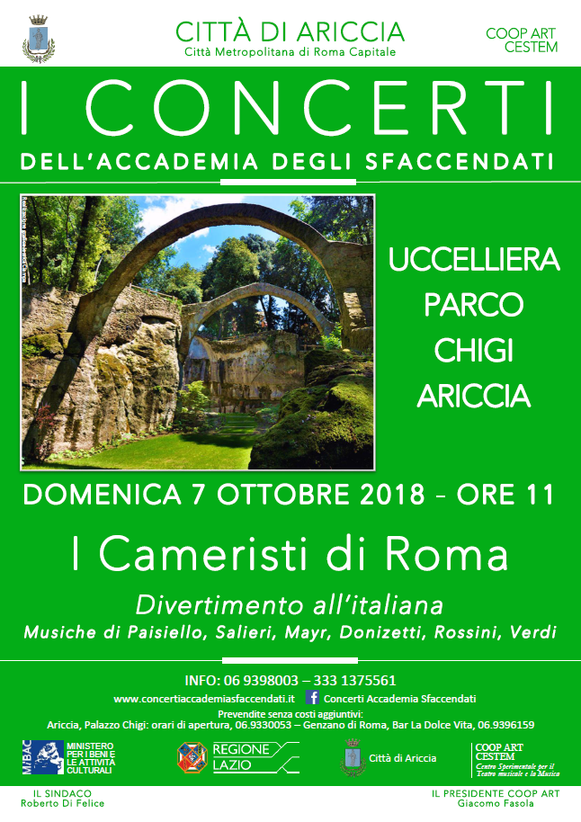 Domenica 7 ottobre, alle ore 11, “I Concerti dell’Accademia degli Sfaccendati” propongono un appuntamento musicale da non perdere: dopo la partecipazione entusiasmante a “Metti…un weekend al Palazzo Chigi di Ariccia”, I CAMERISTI DI ROMA tornano a esibirsi a Palazzo Chigi ma questa volta nel verde del Parco Chigi presso la bellissima Uccelliera fatta costruire dai Savelli.